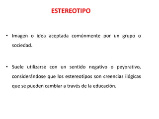Este documento describe varios tipos de estereotipos, incluyendo estereotipos étnicos, de género, de edad, culturales, socioeconómicos y regionales. Explica que los estereotipos son ideas preconcebidas generalizadas sobre grupos de personas. Además, incluye ejemplos comunes de estereotipos sobre cachacos, costeños, paisas, santandereanos y pastusos.