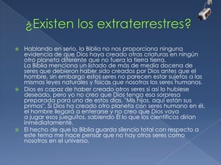 El documento discute la posibilidad de vida extraterrestre. Argumenta que la Biblia no menciona la creación de vida en otros planetas. Aunque Dios podría haber creado otras criaturas, el autor cree que la ausencia de tales referencias en la Biblia significa que no hay otros seres como los humanos en el universo.