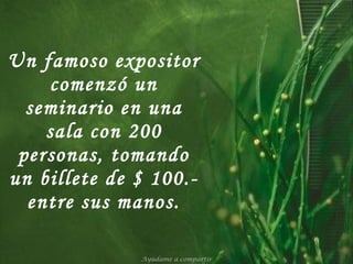 Un expositor usó un billete arrugado y pisoteado para enseñar a una audiencia que a pesar de los desafíos y dificultades que enfrentamos, nuestro valor intrínseco no cambia. Luego les pidió a la audiencia que recuerden a personas famosas y ganadoras de premios versus personas que los han apoyado personalmente, mostrando que son los últimos los que más importan y dejan una huella duradera. El mensaje final es apreciar a aquellos que se preocupan por nosotros.