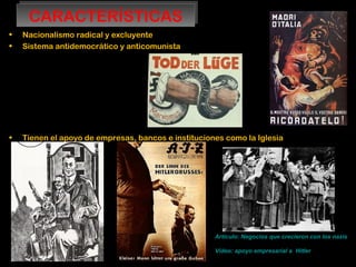 El documento describe el surgimiento y características del fascismo en Europa entre 1920 y 1935. Explica que surgieron regímenes fascistas en Italia, Alemania, Polonia y España, compartiendo características como el nacionalismo radical, el autoritarismo y el culto al líder, pero aportando particularidades propias. También analiza las condiciones que propiciaron su auge, como la debilidad de las democracias, la crisis económica y el descontento social.