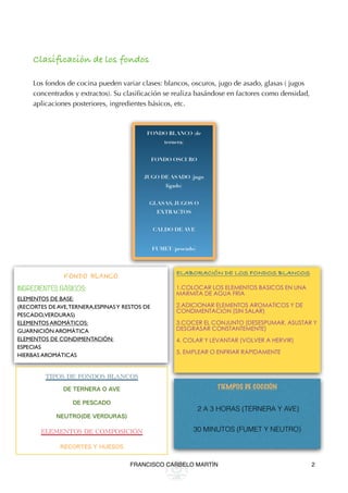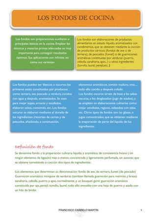 Los fondos son preparaciones culinarias líquidas y aromáticas obtenidas mediante la cocción de ingredientes como carnes, pescados o verduras. Existen dos tipos principales de fondos: los blancos, elaborados solo con agua, y los oscuros, que se obtienen dorando primero los ingredientes. Los fondos se usan como base para salsas, estofados y otros platos.