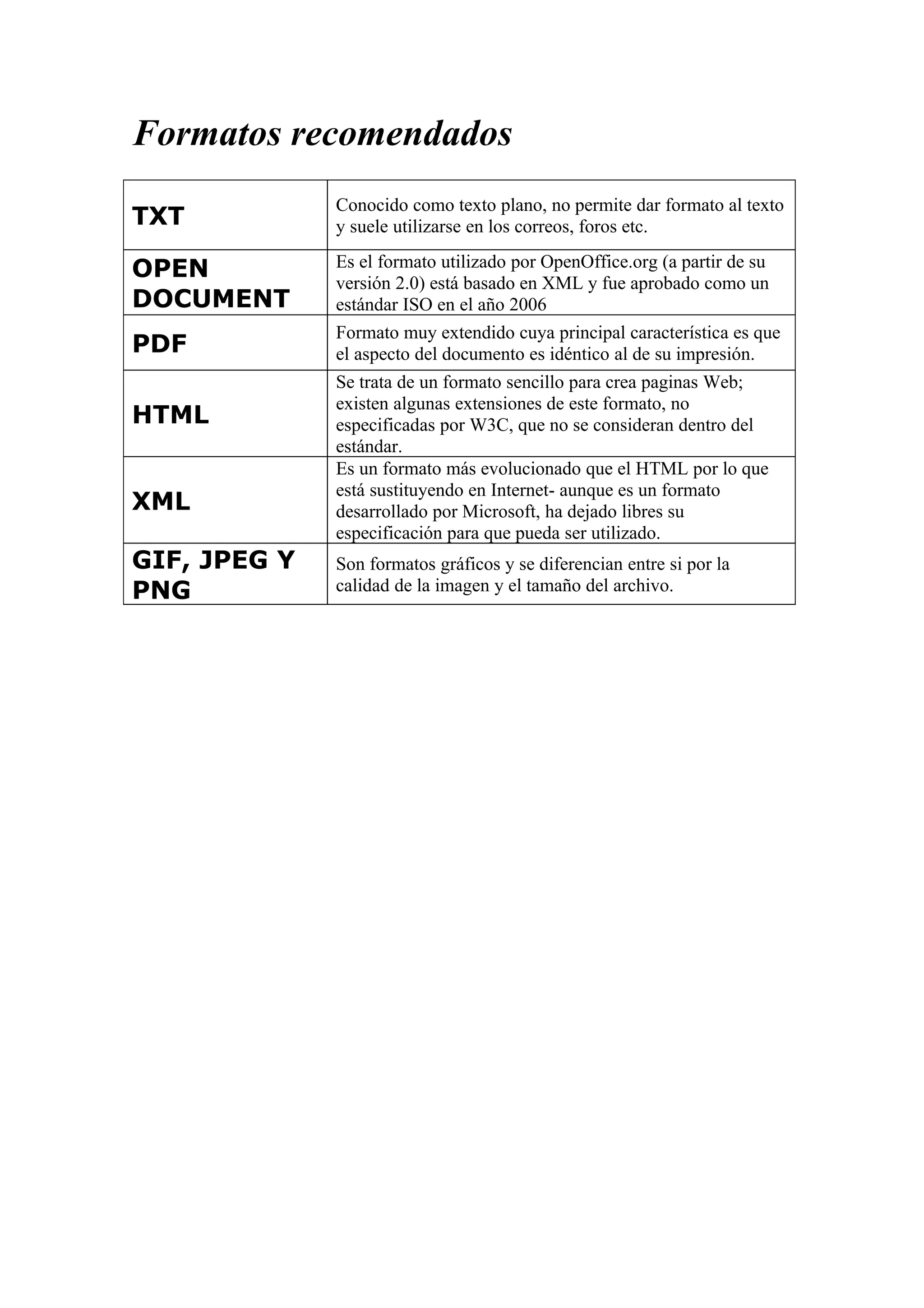 El documento describe diferentes formatos de archivo comúnmente usados, incluyendo TXT para correos y foros, OpenDocument como un estándar ISO para procesadores de texto, PDF para reproducir fielmente documentos, HTML y su evolución XML para páginas web, y formatos gráficos GIF, JPEG y PNG.