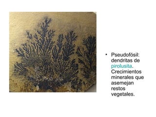 Los fósiles son restos o señales de organismos pretéritos. Para formarse, un fósil debe ser cubierto rápidamente por sedimentos y preservarse durante millones de años, lo que ocurre de forma casual. Existen diferentes tipos de fósiles como restos vegetales o animales petrificados, huellas de actividad biológica como excrementos o pisadas, y pseudofósiles que son formaciones minerales que asemejan restos orgánicos.