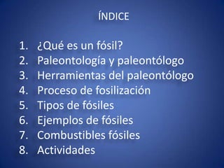 Este documento describe los conceptos clave de la paleontología. Explica que los fósiles son restos de seres vivos antiguos preservados como roca, y que los paleontólogos estudian estos fósiles para aprender sobre la vida pasada. Detalla los tipos de fósiles como huesos, dientes y huellas, e identifica las herramientas que usan los paleontólogos como martillos, brochas y escayola. Finalmente, cubre temas como la fosilización, los combustibles fósiles y algunas actividades prá