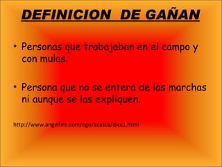 Este documento describe las características de los gañanes, personas que trabajaban en el campo y con mulas. Explica cómo reconocerlos por su vestimenta tradicional y describe algunas de sus agresiones típicas como "tollinas" y bofetadas. También detalla sus fiestas populares, medios de transporte como la mobylette y el tractor, y otras características como su hospitalidad y remedios sanitarios tradicionales.