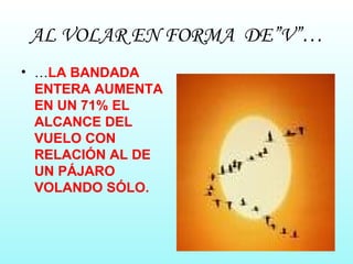 El documento describe las ventajas que tienen los gansos al volar en formación de V. Al volar juntos de esta manera, los gansos pueden aumentar su alcance un 71%, compartir la dirección del grupo para llegar más rápido a su destino, y aprovechar el impulso del pájaro de adelante para volar con menos esfuerzo. La formación también les permite apoyarse unos a otros, especialmente a los débiles o enfermos.