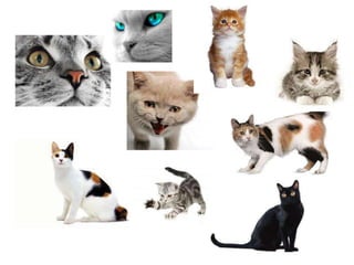 Este documento presenta información sobre los gatos domésticos. Explica que los gatos pertenecen a la familia de los felinos y existen diferentes razas como el bobtail japonés, el siamés tailandés y el angora turco. También describe que los gatos son carnívoros estrictos y necesitan una dieta rica en proteínas animales y agua fresca, así como arena para hacer sus necesidades. Finalmente, recomienda cuidar y no maltratar a los gatos.