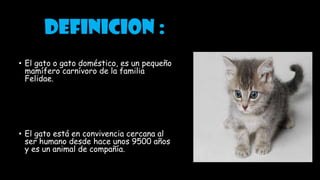 El documento habla sobre los gatos domésticos. Explica que los gatos han estado en compañía de los humanos por unos 9500 años y son animales de compañía. Detalla algunas razas de gatos como el gato absinio, maine coon, y himalayo. También menciona algunas enfermedades comunes en gatos como bolas de pelo y sobrepeso, así como su alimentación usual basada en latas, comida casera y pienso seco.
