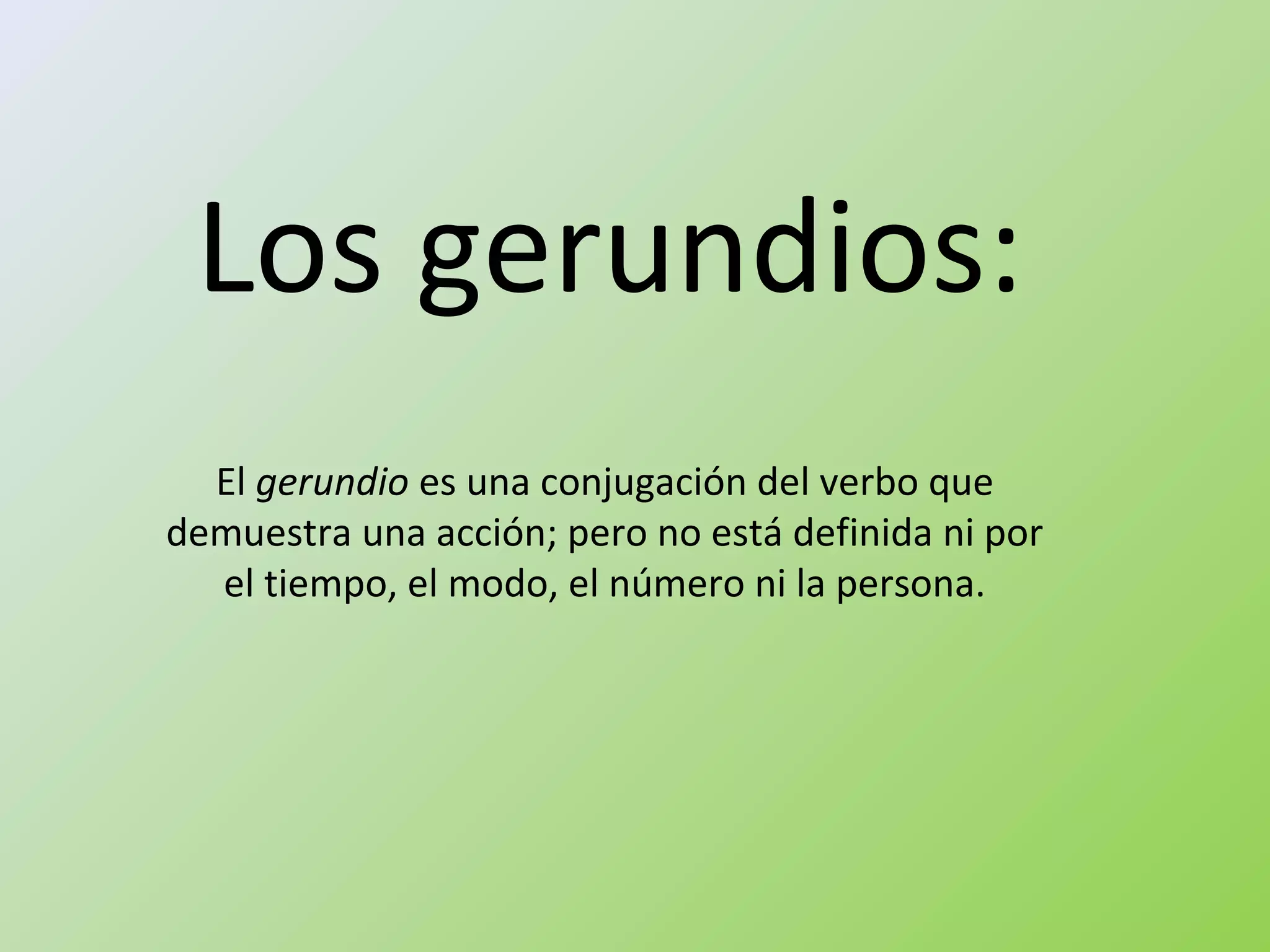 El gerundio es una forma verbal que expresa acciones sin estar definida por tiempo, modo, número o persona. Su correcta utilización implica que el sujeto del gerundio coincida con el de la oración principal y que la acción sea anterior o simultánea a la del verbo principal. Además, el gerundio actúa como complemento circunstancial y no debe calificar sustantivos.