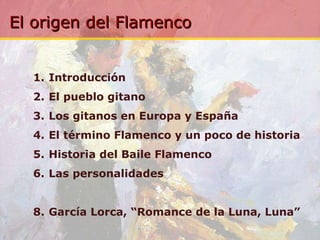 El documento resume la historia del origen del flamenco, desde la llegada de los gitanos a España hasta su evolución como arte. Explica que el flamenco se desarrolló a partir de la cultura gitana y otras influencias en Andalucía. También describe importantes figuras como Lorca, Falla, Camarón de la Isla y Paco de Lucía, y cómo el flamenco se expandió mundialmente en los siglos XX y XXI.
