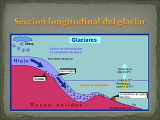 El documento describe los procesos de formación del hielo glaciar a través de la compactación y la fusión-rehielo, así como la erosión que produce un glaciar en forma de "U" mediante la abrasión de las rocas. También explica cómo el glaciar arrastra rocas de diferentes tamaños y formas a lo largo de su descenso, depositándolas de forma angular en la zona terminal al deshielarse y formar una morrena.