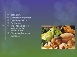 Los glúcidos son biomoléculas orgánicas formadas por carbono, hidrógeno y oxígeno. Existen cuatro tipos principales: monosacáridos como la glucosa y fructosa, disacáridos como la sacarosa y lactosa, oligosacáridos de 3 a 10 moléculas, y polisacáridos en cadenas de más de diez moléculas. Los glúcidos cumplen funciones energéticas como combustible y estructurales formando parte de paredes celulares. Es importante incluirlos en la di