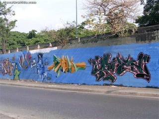 Este documento define qué es un graffiti y describe sus características. Explica que un graffiti es una inscripción o pintura generalmente hecha sin permiso en propiedades públicas o privadas. Además, menciona que los graffiteros a menudo se agrupan en crews y que el graffiti también se refiere a un movimiento artístico que comenzó en la década de 1960 en Nueva York.