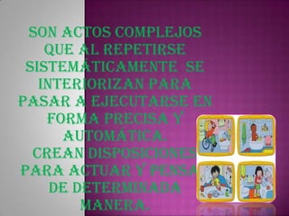 Los hábitos son actos que se repiten sistemáticamente y se interiorizan para ejecutarse de forma automática, creando disposiciones para pensar y actuar de ciertas maneras. Se forman principalmente por la repetición constante, la influencia del medio ambiente y la necesidad de adaptación. Una vez establecidos, los hábitos son difíciles de modificar y pueden ser buenos o malos dependiendo de si generan eficiencia o no.