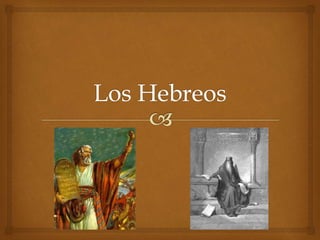 El documento resume la historia del pueblo hebreo en la región del Cercano Oriente conocida como Palestina. Los hebreos emergieron como un pueblo semita liderado por patriarcas como Abraham, Jacob y Moisés. Más tarde, bajo jueces como Josué y reyes como Saúl, David y Salomón, establecieron el reino unido de Israel. Aunque el reino se dividió y sufrió invasiones, los hebreos contribuyeron al monoteísmo y la Torá como libro sagrado.