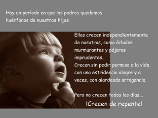 Este documento habla sobre la inevitable transición de los hijos desde la niñez a la adultez y la independencia. Describe cómo los padres quedan "huérfanos" a medida que los hijos crecen y se separan, dejando atrás las fiestas infantiles y pasando al volante de sus propias vidas. Finalmente, los padres quedan esperando ver a sus hijos elegir su camino en el mundo, mientras ansían la llegada de nietos que les permitan expresar su afecto nuevamente.