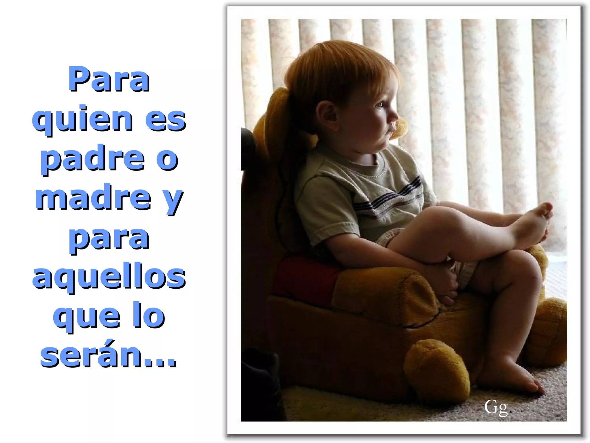 Este documento habla sobre la experiencia de los padres al ver crecer e independizarse a sus hijos. Explica que los hijos crecen rápidamente e independientemente de sus padres, y que los padres quedan "huérfanos" de sus hijos cuando estos dejan de necesitar su guía y protección. También enfatiza la importancia de que los padres pasen tiempo de calidad con sus hijos y les demuestren afecto antes de que estos crezcan.