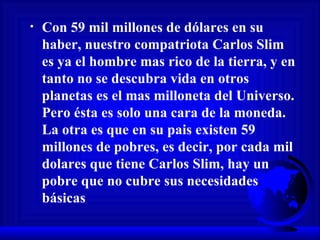 1) Carlos Slim es actualmente el hombre más rico del mundo con 59 mil millones de dólares, mientras que en México hay 59 millones de personas en pobreza.