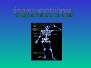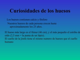 El esqueleto humano está formado por 206 huesos que cumplen funciones como dar forma al cuerpo, permitir el movimiento, proteger órganos vitales y producir células sanguíneas. Los huesos más grandes son el fémur en las piernas y los más pequeños son los del oído interno, y aunque todos los seres humanos tenemos los mismos huesos, su tamaño y densidad cambian a lo largo de la vida.