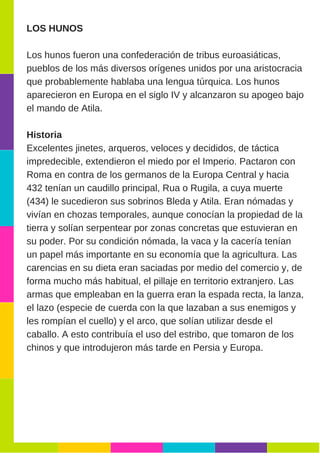 Los hunos fueron una confederación de tribus nómadas que aparecieron en Europa en el siglo IV d.C. Bajo el mando de Atila alcanzaron su máximo poder. Eran excelentes jinetes y arqueros que sembraron el terror en el Imperio Romano. Su origen étnico sigue siendo controvertido, aunque probablemente hablaban una lengua túrquica o irania. Practicaban el pillaje y el comercio para complementar su dieta basada en la ganadería.