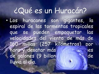 Los huracanes se forman en tres etapas: 1) depresión tropical con vientos de hasta 62 km/h, 2) tormenta tropical con vientos de 63-117 km/h y pequeño ojo, 3) huracán con vientos de hasta 370 km/h y diámetro de 500-900 km. Se forman en varias cuencas oceánicas como la del Atlántico y pueden causar marejadas, vientos fuertes, lluvias intensas y tornados.