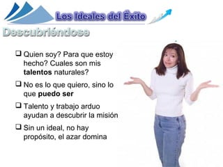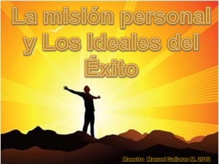 Este documento trata sobre la importancia de tener ideales y una misión en la vida para evitar caer en la mediocridad. Primero explora preguntas sobre la identidad y los talentos naturales de uno. Luego discute que sin un ideal no hay propósito y que los ideales individuales y colectivos son creados por la imaginación. Finalmente concluye que los mediocres viven desde afuera y carecen de una personalidad distintiva, mientras que los exitosos aportan valor y dejan un legado positivo.