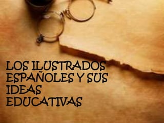 Este documento resume las ideas educativas de varios ilustrados españoles del siglo XVIII como Feijoo, Olavide y Sarmiento. Promovían una educación basada en la razón y el conocimiento científico, y propusieron reformas como eliminar el método de los dictados, introducir nuevas materias en la universidad, y establecer escuelas públicas aunque con diferencias entre educación para ricos y pobres.