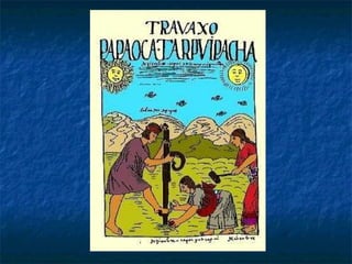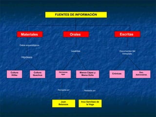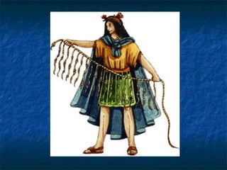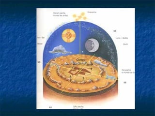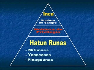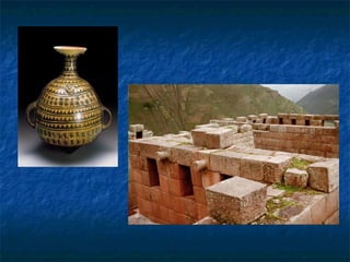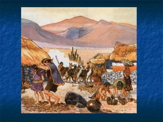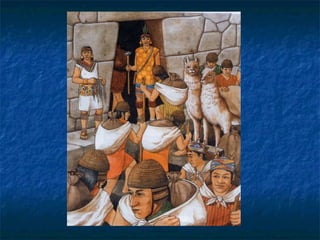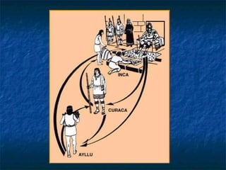 El documento resume aspectos clave de la cultura inca, incluyendo su territorio dividido en cuatro regiones, la importancia del ayllu como unidad social y económica, y la administración centralizada del estado inca a través de funcionarios, quipus y caminos. También describe elementos de su economía basada en la reciprocidad y redistribución, su organización del trabajo a través de la mita y otras formas de servicio comunal, y sus logros arquitectónicos y artísticos.