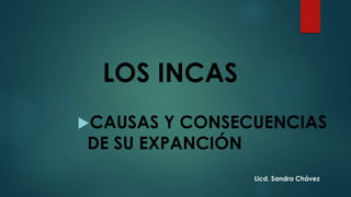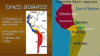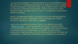 El documento describe la expansión del Imperio Inca en el Ecuador entre los siglos XV y XVI, liderada por los incas Atahualpa y Huayna Cápac. El Imperio Inca conquistó Quito y Tomebamba, ciudades que se volvieron muy importantes. Luego de la muerte de Huayna Cápac, estalló una guerra civil entre sus hijos Atahualpa y Huáscar por el control del trono. Esta guerra debilitó al imperio y facilitó su posterior conquista por los españoles dirigidos por Francisco Pizarro.