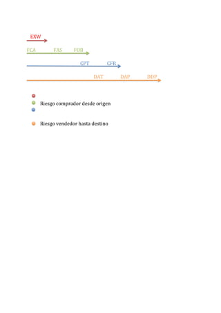 Los INCOTERMS son términos comerciales internacionales que aclaran las responsabilidades de las partes en una transacción de compraventa internacional con respecto a la entrega de la mercancía, el riesgo de transporte y los gastos. Los INCOTERMS especifican quién es responsable de los trámites aduaneros y el seguro, pero no se ocupan de otros aspectos como los derechos de propiedad o las consecuencias del incumplimiento. Existen varios términos como EXW, FOB, CIF y DDP que definen