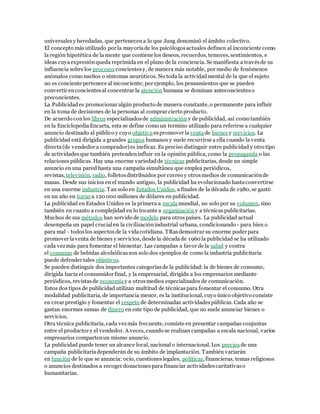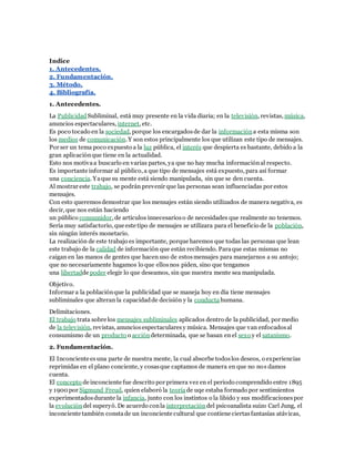 El documento trata sobre los mensajes subliminales en la publicidad. Explica que los mensajes subliminales pueden influir en la mente de forma inconsciente para manipular las decisiones y el comportamiento de las personas. Describe un estudio de 1957 que mostró que los mensajes subliminales "Come palomitas" e "Bebe Coca-Cola" aumentaron las ventas de esos productos. El objetivo es informar al público sobre la existencia de esta técnica para que no sean influenciados sin su consentimiento.