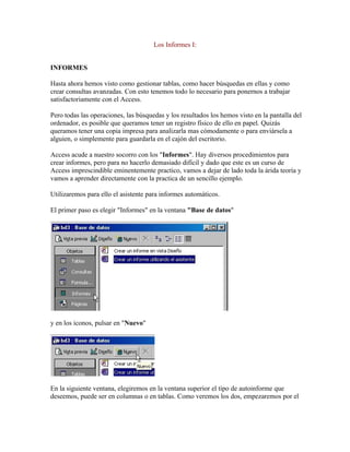Este documento explica cómo crear informes en Access para imprimir la información de las tablas y consultas. Describe cómo usar el asistente para informes automáticos para crear fácilmente informes en columnas y tablas sobre las tablas y consultas existentes. Explica que los informes permiten tener una copia impresa de la información almacenada en Access para su análisis o envío a otros usuarios.