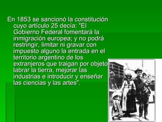 La constitución argentina de 1853 fomentó la inmigración europea para mejorar la agricultura, industrias, ciencias y artes. Los presidentes Mitre, Sarmiento y Avellaneda promovieron fuertemente la inmigración, especialmente de España e Italia. Más tarde llegaron inmigrantes de Turquía, los países árabes, Siria y Grecia. La primera colonización ocurrió bajo el gobierno de Urquiza, dándole tierras a familias suizas, francesas y alemanas. La Argentina creci