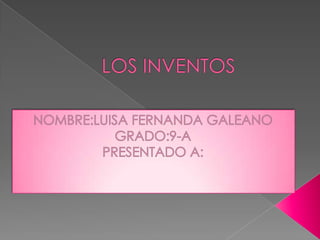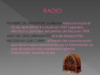 El documento resume información sobre varios inventos importantes como la radio, la televisión, la electricidad, la computadora y los rayos láser. Para cada invento, se proporciona el nombre del inventor principal, el año de descubrimiento y la necesidad que cubrió. Algunos de los inventores mencionados son Guillermo Marconi, John Logie Baird, Thomas Edison, John Vincent Atanasoff y Teodoro Maiman. El documento concluye que aprendió sobre las biografías de estos inventores y los años en que se crearon estos inventos que ahora