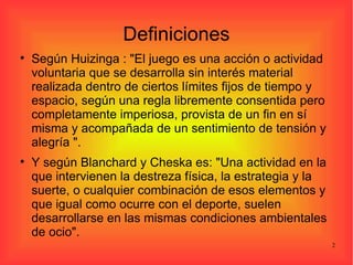 El documento describe diferentes tipos de juegos que se pueden utilizar en educación física. Define el juego según Huizinga y Blanchard como una actividad voluntaria dentro de ciertos límites que provoca alegría. Explica las características del juego como ser placentero y tener un fin en sí mismo. Luego detalla varios tipos de juegos como los tradicionales, cooperativos, de lanzamiento y recepción, de persecución, predeportivos y sensoriales.