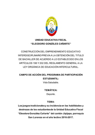 Este documento describe un proyecto educativo interdisciplinario sobre los juegos tradicionales y su incidencia en las habilidades de los estudiantes de la Unidad Educativa Fiscal “Eleodoro González Cañarte” en Jipijapa, Ecuador. El proyecto busca determinar la importancia de los juegos tradicionales mediante su práctica con los estudiantes y la elaboración de un folleto para promoverlos. El documento incluye la justificación, objetivos, marco teórico y metodología del proyecto.