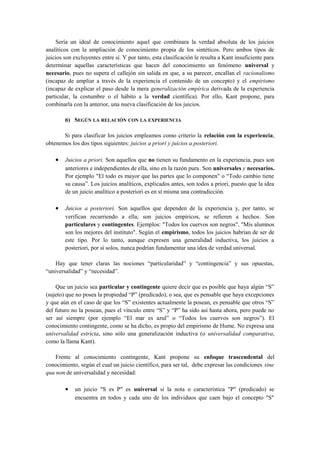 Este documento resume la teoría de los juicios de Kant. Kant clasifica los juicios según dos criterios: 1) la relación del predicado con el sujeto, dando lugar a juicios analíticos (el predicado está contenido en el sujeto) y sintéticos (el predicado aporta nueva información); y 2) la relación con la experiencia, dando lugar a juicios a priori (no dependen de la experiencia) y a posteriori (dependen de la experiencia). Solo los juicios sintéticos a priori cumplen los requ