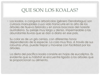 Los koalas son marsupiales arborícolas que viven en los árboles de eucalipto de Australia y Nueva Zelanda. Tienen un pelaje grueso y gris que los protege de la lluvia, y garras robustas que les permiten trepar y moverse fácilmente por los árboles. Se alimentan exclusivamente de hojas de eucalipto y pueden medir hasta 85 cm de largo y pesar 15 kg.