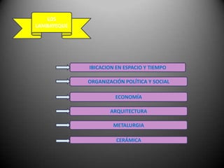 La cultura Lambayeque se desarrolló entre los 700-1350 d.C. en los valles de Motupe y Jequetepeque en Perú. Tenían una organización política y social rígida con estratificación entre la élite, administradores, artesanos y agricultores. Su economía se basaba en la agricultura irrigada de cultivos como maíz y algodón. Construyeron el complejo arquitectónico de Batán Grande con 17 pirámides de 30 metros, y destacaban en metalurgia, produciendo objetos ceremoniales