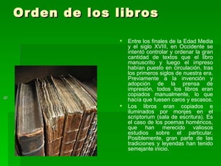 Entre la Edad Media y el siglo XVIII, los textos escritos a mano y luego impresos se multiplicaron, requiriendo un ordenamiento. Antes de Gutenberg, los libros eran copiados a mano por monjes y eran caros. El papiro fue el primer soporte de escritura en el Mediterráneo antiguo, pero fue reemplazado por el pergamino, más duradero. Los manuscritos iluminados complementaban los textos con ilustraciones y decoraciones.