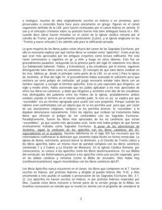 Los libros apócrifos, establecidos como tales por Jerónimo, son escritos religiosos no incluidos en el canon bíblico, que aunque no son considerados inspirados, reflejan temas relevantes del desarrollo de la fe y la historia entre el Antiguo y el Nuevo Testamento. La existencia de libros deuterocanónicos reconocidos por la Iglesia Católica, pero considerados apócrifos por los protestantes, refleja una larga disputa sobre la inspiración y el valor histórico de estos textos. A través de varios concilios y el trabajo de figuras como Jerónimo y Lutero, se ha intentado mantener una distinción entre los textos canónicos y los apócrifos, que a menudo se confunden en la práctica.