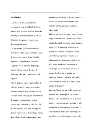 Los macrófagos son células especializadas del sistema inmune que se encargan de reconocer y destruir organismos extraños mediante el mecanismo de fagocitosis. Tienen su origen en la médula ósea y pueden viajar por el organismo buscando patógenos y células muertas para eliminarlos, desempeñando un papel importante en la respuesta inmunitaria innata.
