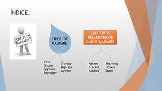 Este documento describe diferentes tipos de malware y amenazas informáticas como virus, gusanos, spyware, troyanos y phishing. Explica que el malware es cualquier software dañino con el objetivo de afectar ordenadores u otros dispositivos. Luego define cada tipo de malware detallando sus características y cómo funcionan para infectar y dañar sistemas. También menciona conceptos relacionados como hackers, crackers, cookies y spam. Por último, da consejos para evitar virus como mantener el antivirus actualizado y no responder a correos sospechosos