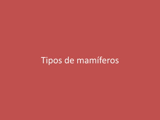 Este documento describe los diferentes tipos de mamíferos, incluyendo marsupiales, monotremas, insectívoros, quirópteros, desdentados, roedores, cetáceos, sirenios, pinnípedos, carnívoros, perisodáctilos, artiodáctilos y proboscídeos. Provee detalles breves sobre las características distintivas de cada grupo.