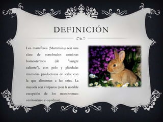 Los mamíferos son una clase de vertebrados que se caracterizan por producir leche para alimentar a sus crías, tener pelo y mantener una temperatura corporal constante. Los mamíferos modernos descienden de los sinápsidos que dominaron la tierra hace 245 millones de años, aunque algunos dinosaurios los fueron reemplazando. Los primeros mamíferos verdaderos aparecieron hace unos 220 millones de años al final del período Triásico.
