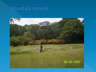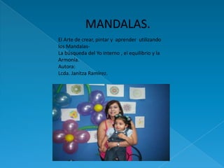 Este documento describe los mandalas, sus orígenes en la India y su uso en terapias psicológicas. Los mandalas representan la totalidad de la mente y el ser humano. Dibujarlos desarrolla ambos hemisferios cerebrales y ayuda a lograr equilibrio interior, concentración y conexión con uno mismo. Los colores y figuras en los mandalas también tienen significados espirituales y psicológicos.