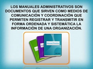 Los manuales administrativos describen la estructura organizativa de una empresa y especifican las funciones y responsabilidades de cada unidad y puesto. Explican la jerarquía y las relaciones entre las diferentes áreas para lograr los objetivos de la organización de manera ordenada y sistemática.