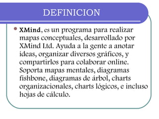 XMind es un programa para crear mapas mentales y otros gráficos como diagramas de flujo y árboles. Permite organizar ideas de manera visual y compartir los mapas en línea para colaborar. Fue desarrollado bajo licencias open source y puede exportar los mapas a diferentes formatos como PowerPoint y PDF. Su objetivo principal es facilitar sesiones de creatividad en empresas y escuelas mediante la organización y relación de ideas en una estructura jerárquica visual.