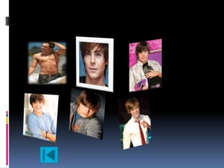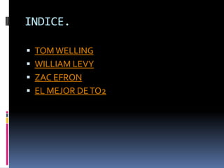 Este documento presenta información biográfica y fotografías de cuatro atractivos actores: Tom Welling, conocido por su papel en Smallville; William Levy, actor y exmodelo cubano; Zac Efron, famoso por High School Musical; y el dios Eolo de la mitología griega, quien recientemente ha sido visto en México.