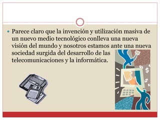 El documento describe la evolución de los medios de comunicación masivos y su influencia en la sociedad. Explica que los avances tecnológicos han llevado a una mayor mediatización de la vida social y el establecimiento de la comunicación como elemento clave para entender la sociedad. Describe las características y funciones de la radio y la televisión como medios masivos, incluyendo su rapidez, accesibilidad, capacidad de adaptarse a audiencias diversas y roles de informar y entretener.